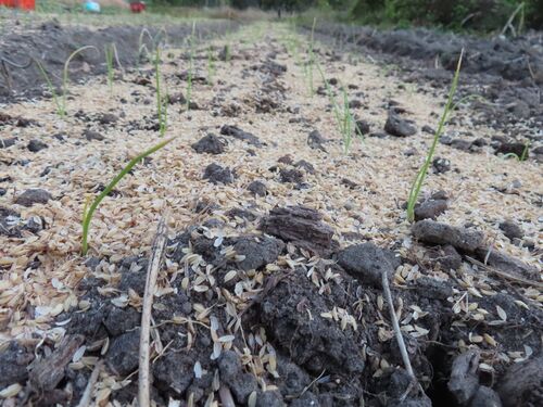 兄が菌ちゃん畑さんにラッキョウを植え付けしていたので紹介していきます。 こちらがラッキョウさんになります。 黒マルチに穴を空けて、一つ一つ植え付けを行っていましたね。 元気に育ってくれる事を祈ります。 あと、兄が草むらにジョウロのハス口さんを…